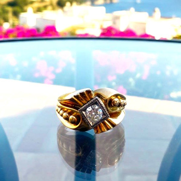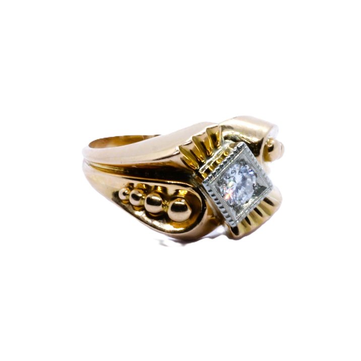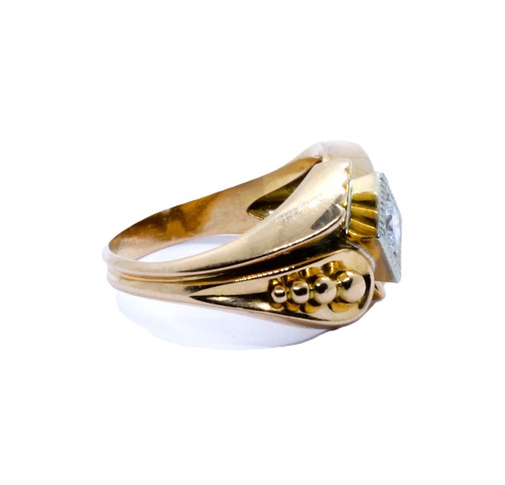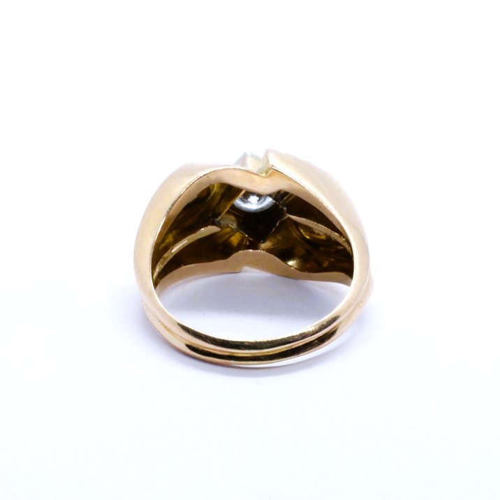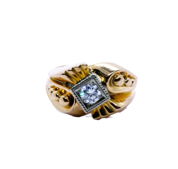 Anello in oro giallo e bianco (solo la cornice del diamante) 18kt. Alta qualità del diamante taglio brillante di 0,40 carati circa. Peso gr. 4,98. 1950 ca.