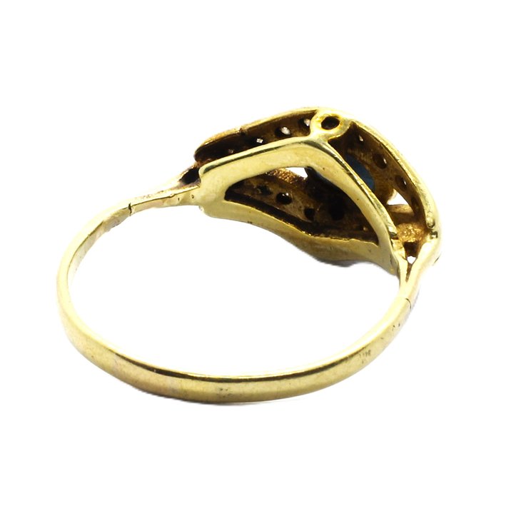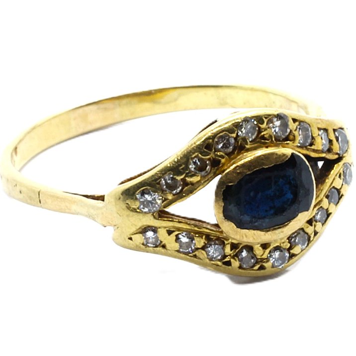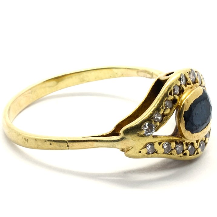 Anello in oro giallo 18kt, zaffiro e diamanti taglio brillante. La misura (sempre modificabile) è 16/56, il peso 3,07 grammi.
