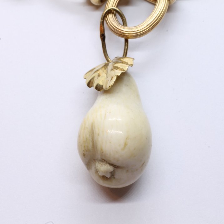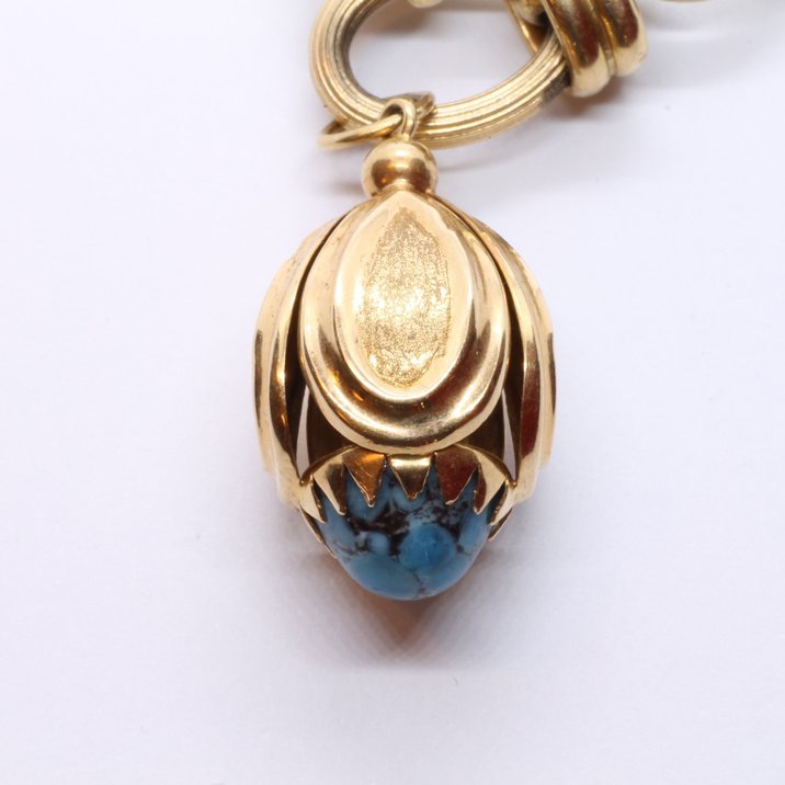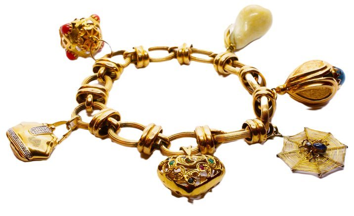 Bracciale "charms" anni 50 in oro giallo 18kt, diamanti taglio brillante, corallo, avorio, turchese, diamante taglio rosetta e zaffiro cabochon. Peso gr. 36,73.