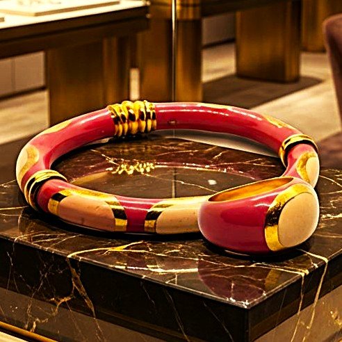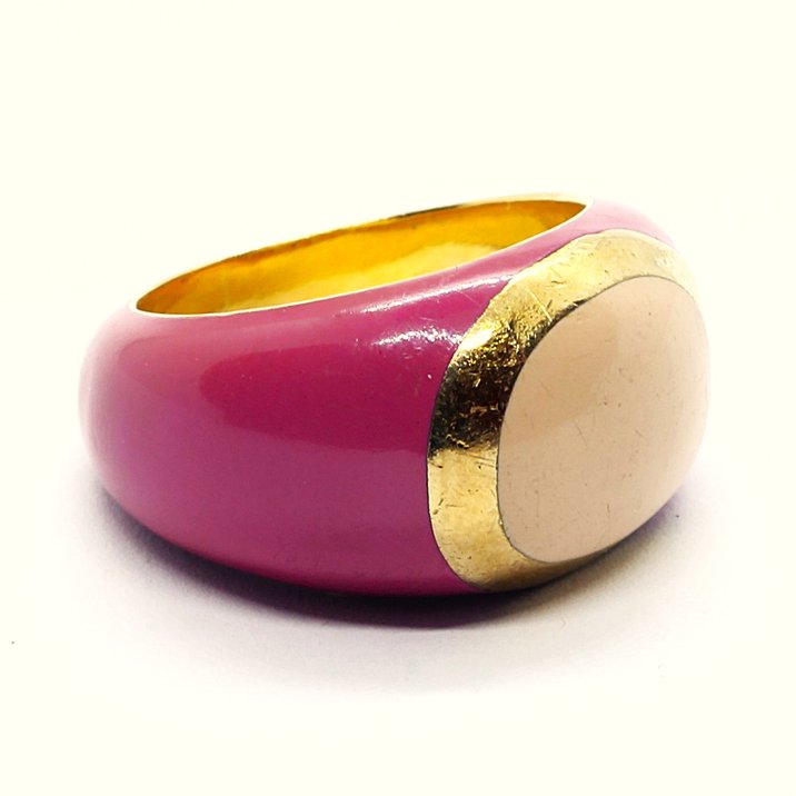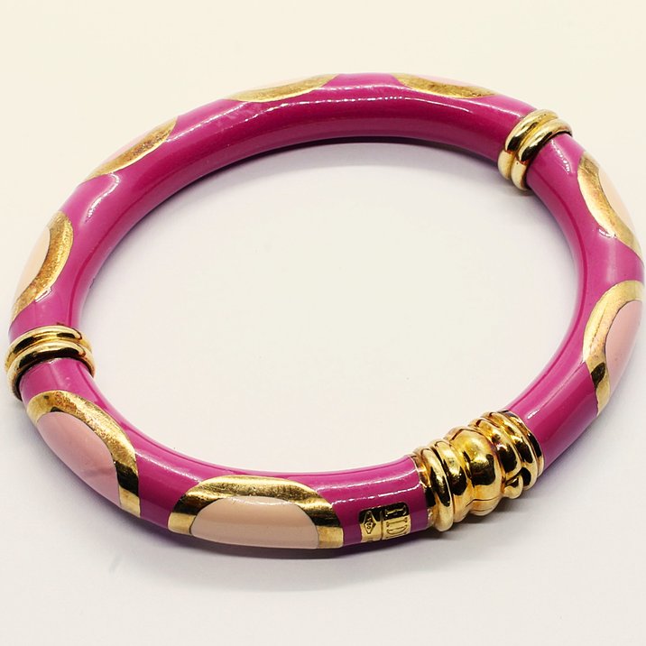 Bracciale e anello Fidia in oro giallo 18kt e smalti policromi. Gioielli firmati e punzonati. Il bracciale (snodabile) pesa gr. 38,58 e l'anello gr. 13,86.