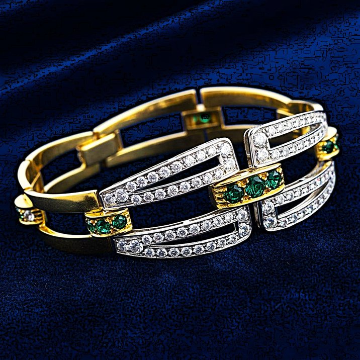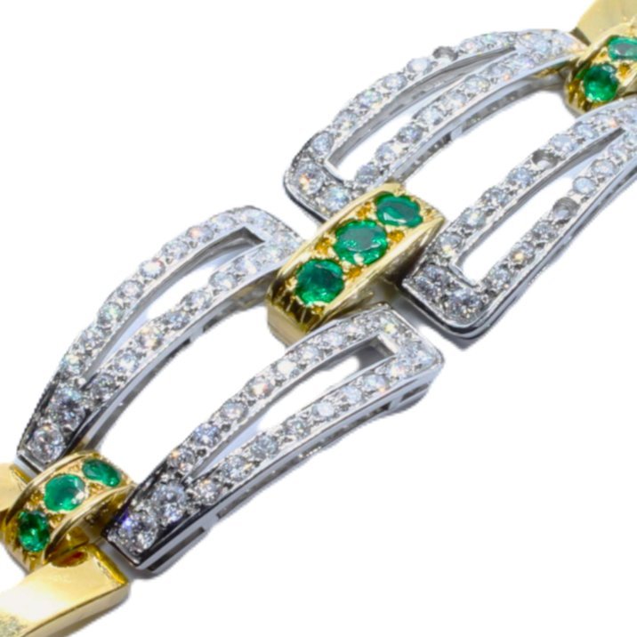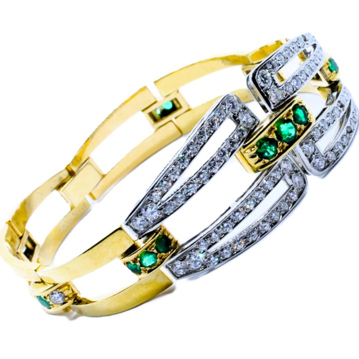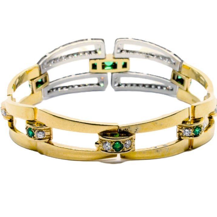 Bracciale in oro giallo 18kt e platino, smeraldi e diamanti taglio brillante di altissima qualità per 1,20 carati ca. Pesa gr. 47,90. Porta la firma "Ansuini Roma". Viene venduto accompagnato dalla certificazione originale dell'epoca e dal Certificato Gemmologico Toscana Oro & A. La pregevole manifattura del bracciale è da far risalire ai primi anni 70.