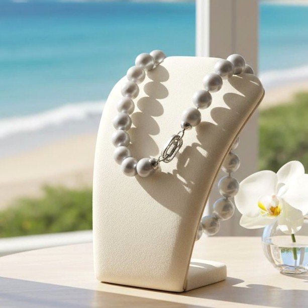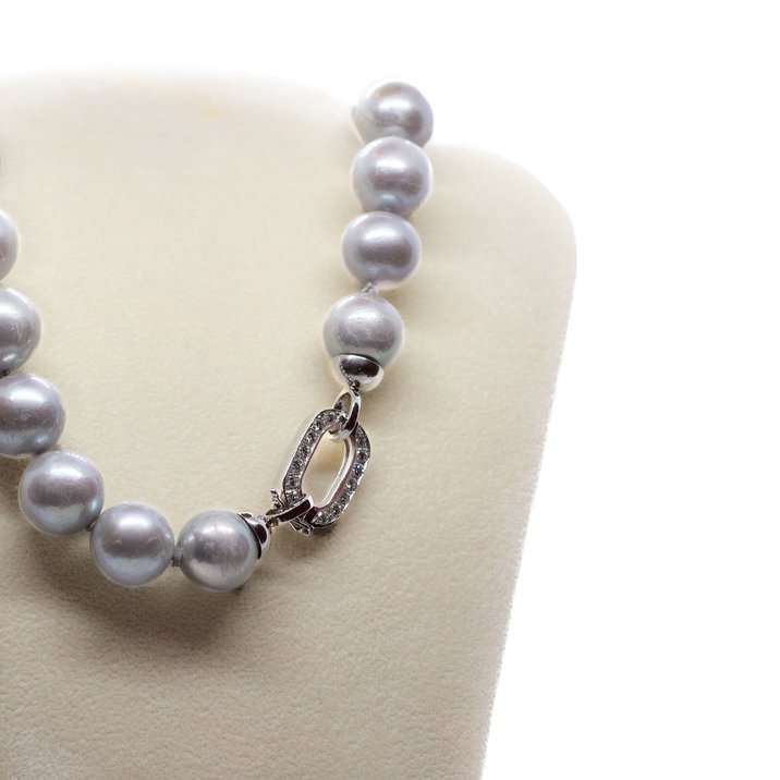 Sono trentuno bellissime perle "south sea" grigio chiare e chiusura in oro bianco 18kt su cui sono incastonati ventotto diamanti tg. brillante. Il diametro delle perle, leggermente degradè, va da un minimo di 12,30 mm. ad un massimo di 16,70 mm. Peso totale 105,78 grammi.