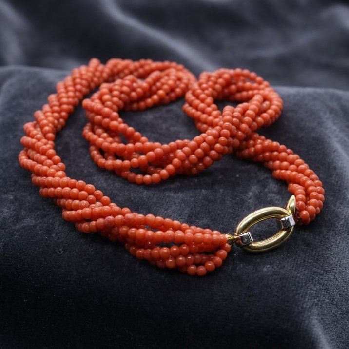Collana "torchon" in corallo rosso con fermezza in oro bianco e giallo 18kt. Lunghezza cm. 50,5. Peso gr. 58,78.