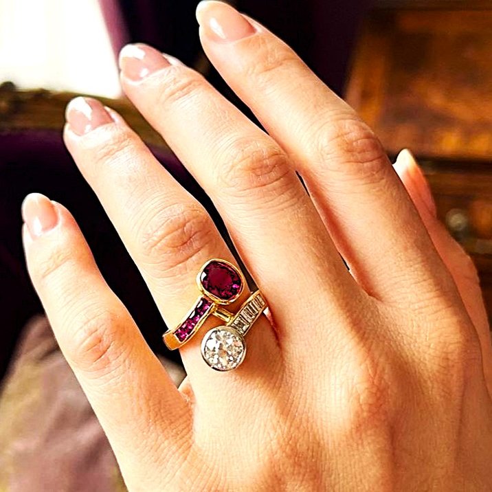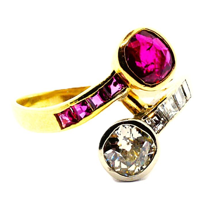 Anello "contrariè" degli anni 40 in oro giallo e bianco 18kt; oro giallo sulla parte che incastona i rubini e oro bianco sulla parte che incastona i diamanti. Il diamante di maggior caratura (1,0 ct. ca.) è un taglio cosiddetto "old mine" e gli altri più piccoli sono taglio "carrè", il rubino principale è un taglio "a cuscino" e taglio "carrè" quelli di contorno. Tutte le pietre sono di elevata qualità per purezza, colore e accuratezza del taglio. Peso totale dell' anello 5,18 grammi. E' provvisto di Certificato Gemmologico.