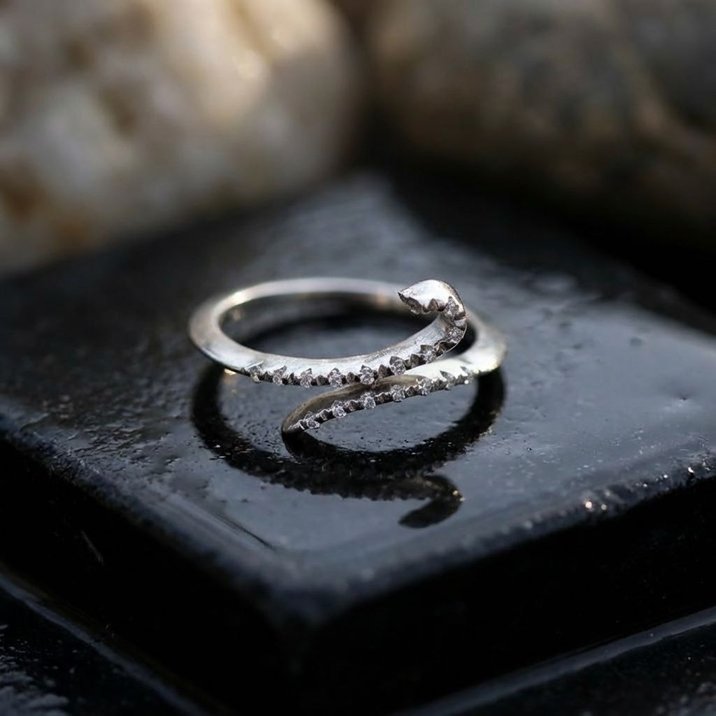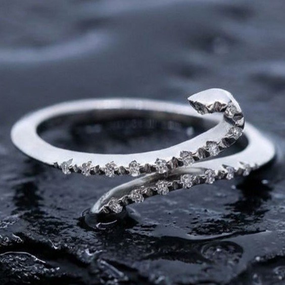 Delizioso anello "contrariè" in oro bianco 18kt con diciassette diamanti taglio brillante. Misura 14/54. Peso gr. 2.89.