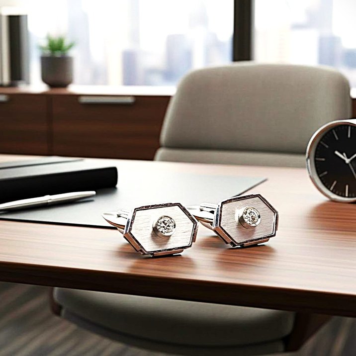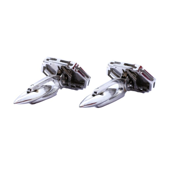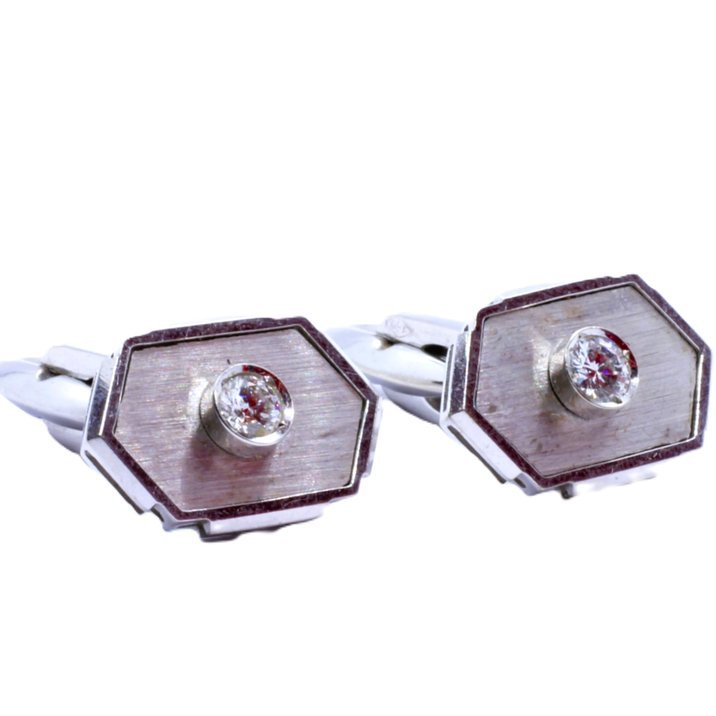 Gemelli in oro bianco 18kt ognuno dei quali ha nel centro un diamante taglio brillante di 0,20 ct circa. Pietre di altissima qualità per purezza, colore e accuratezza del taglio. Peso totale gr. 8,27.