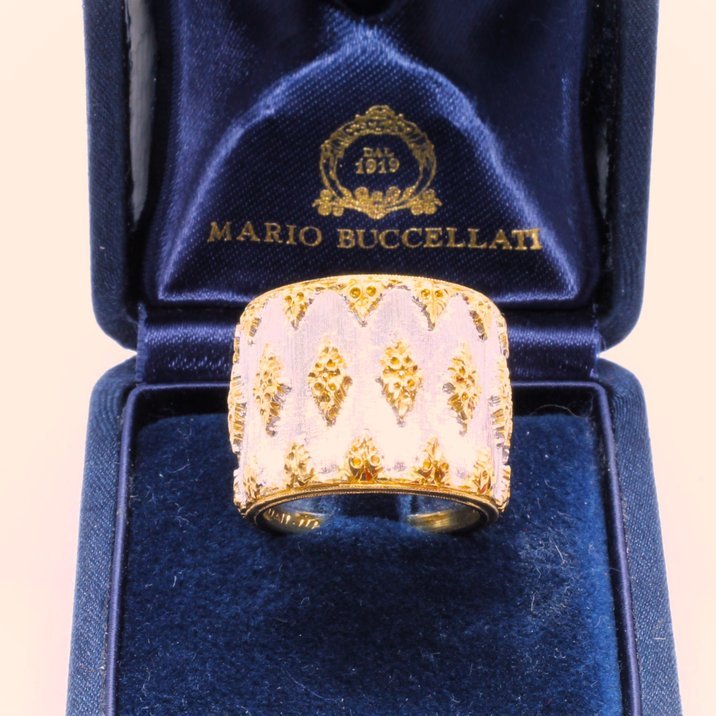 Anello Mario Buccellati in oro 18kt giallo e bianco nella classica lavorazione. Firmato sul bordo interno. Pesa gr. 16,70. 1950 ca.