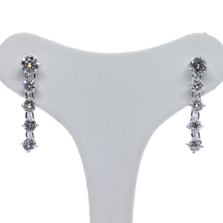 Altissima la qualità dei diamanti, per una caratura complessiva di 1,50 carati circa, in questi orecchini pendenti realizzati in oro bianco 18kt. Lunghezza max. mm. 24,0: Peso gr. 3,34.