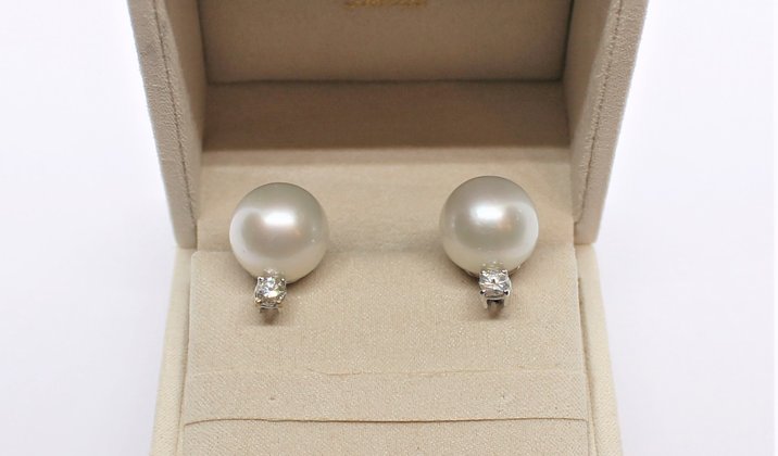 Orecchini in oro bianco 18kt, perle "australia" di 14,0 mm. di diametro e diamanti taglio brillante per 0,30 ct. ca. cadauno. Certificato Gemmologico.