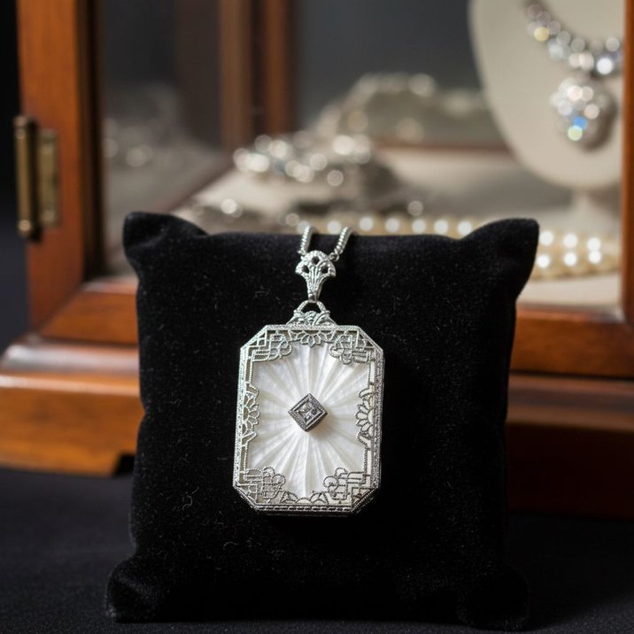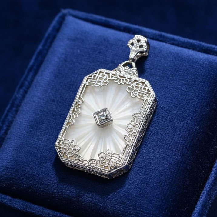 Collino con pendente in oro bianco 18kt e cristallo di rocca sabbiato e inciso a raggiera con al centro un diamante "single cut". Periodo Liberty.