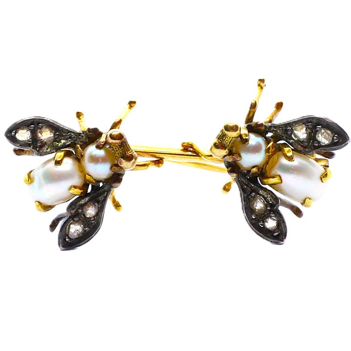 Spilla primi 900 in oro giallo 18kt, argento, perle e diamanti taglio rosetta. Peso gr.8,25.