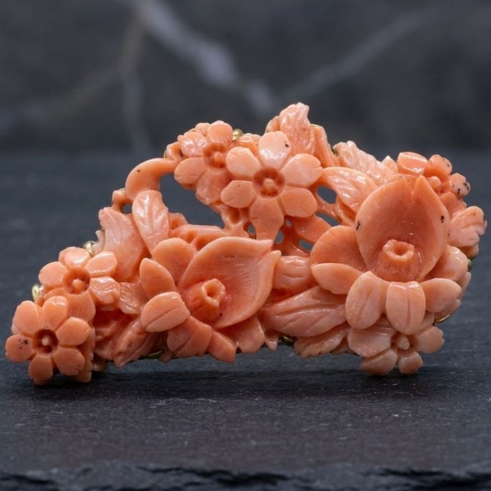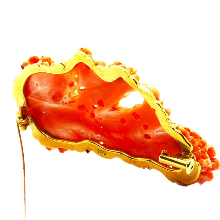 Scultura rappresentante gruppo di fiori in corallo rosa su cornice di oro giallo 18kt, il tutto a formare una spilla. Mm. 62x37. Pesa 23,57 grammi.