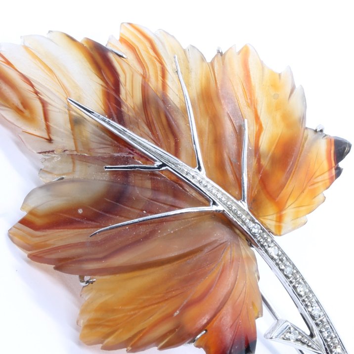 Agata scolpita a guisa di foglia retta da un "gambo" in oro bianco 18kt impreziosito da nove diamanti taglio "single cut". Lunghezza max. 65 mm. larghezza max. 45 mm. Peso gr. 13,00.