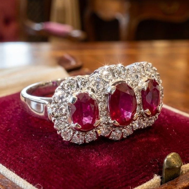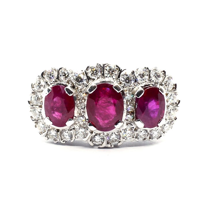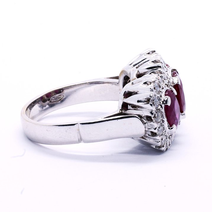 Bellissimi rubini birmani montati su oro bianco 18kt contornat da 32 diamanti taglio "single cut". Peso gr. 4,92.