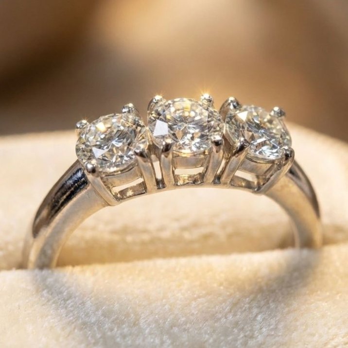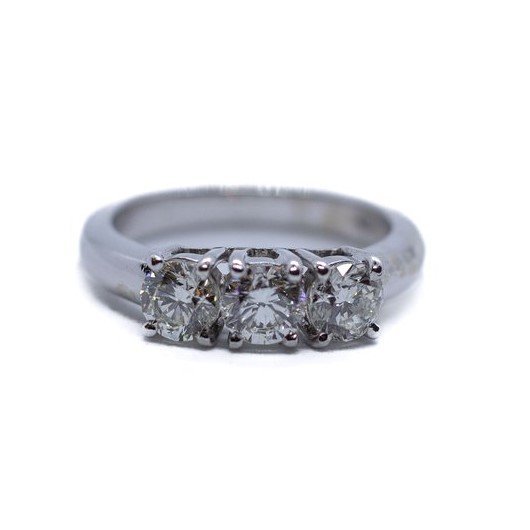 Anello "Trilogy" in oro bianco 18kt e diamanti tg. brillante di 0.25 carati ca. cadauno. I diamanti sono di alta qualità per quanto riguarda purezza, colore e qualità del taglio. Mis.13/53. Peso totale dell'anello gr.4.08. Provvisto di Certificato Gemmologico.