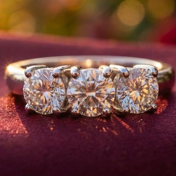 Anello "trilogy" in oro bianco 18kt e diamanti tg. brillante da 0,50 ct. ca. cadauno. I diamanti, di ottima qualità, sono certificati. Mis.15/55. Peso gr.5,03.