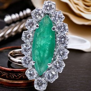 Anello in oro bianco, diamanti taglio brillante e smeraldo.