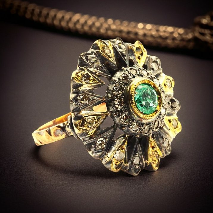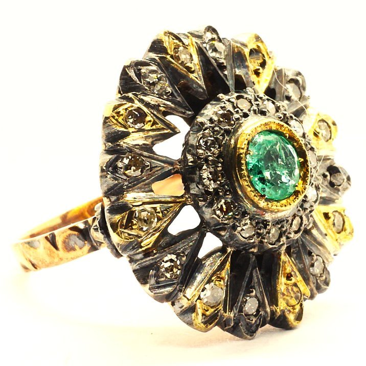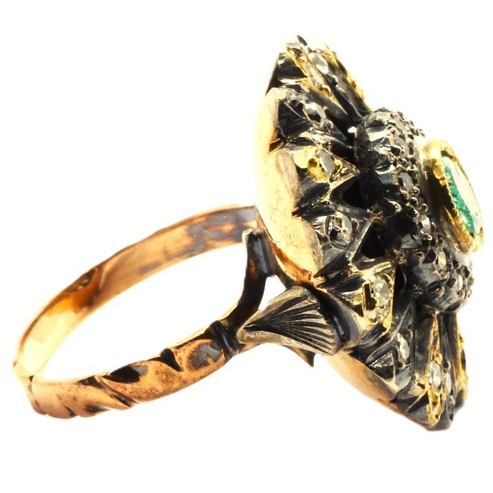 14kt yellow gold single cut diamonds and emerald anique ring. Amazing workship, the total weight is 9,22 grams.