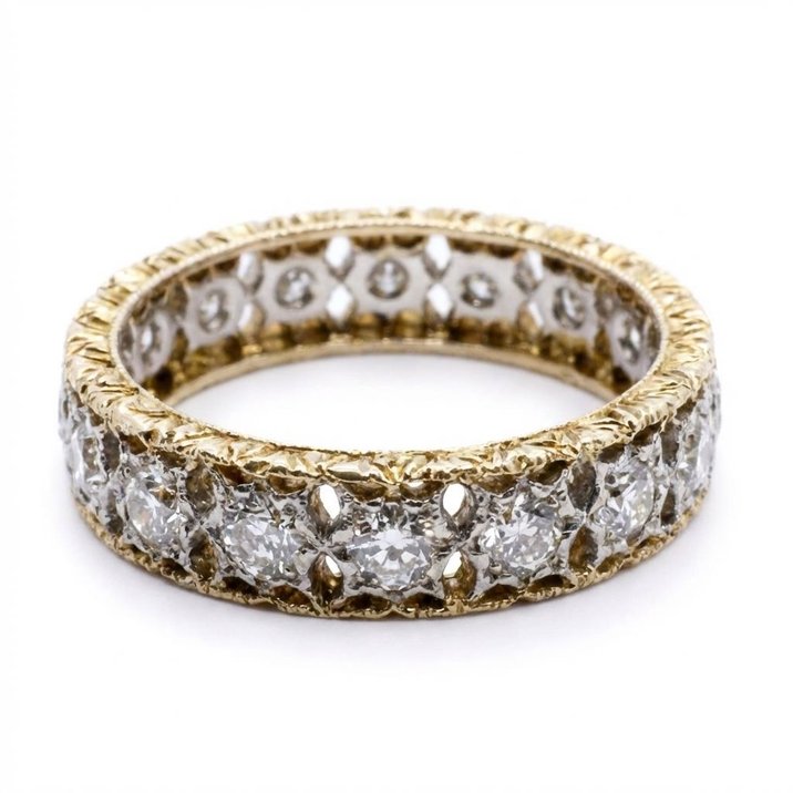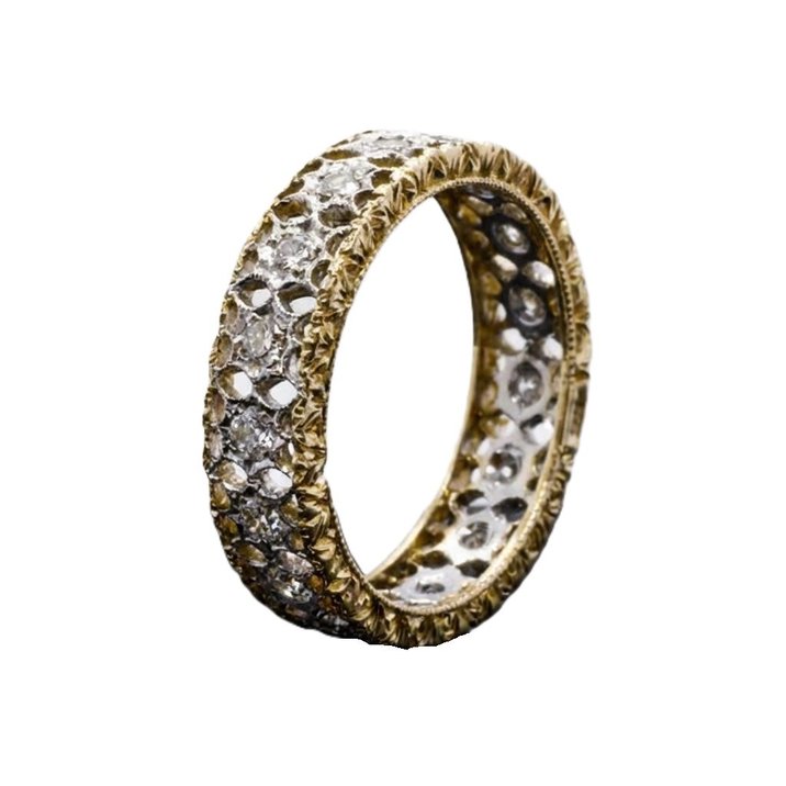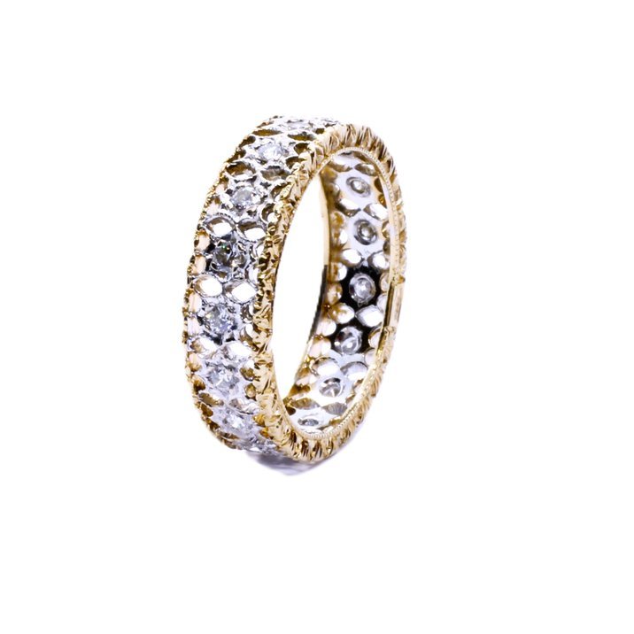 18kt yellow and white gold ring, round cut brilliant diamonds, gorgeous Buccellati style handcraft; ring size 54/14, weight 3,64 grams.