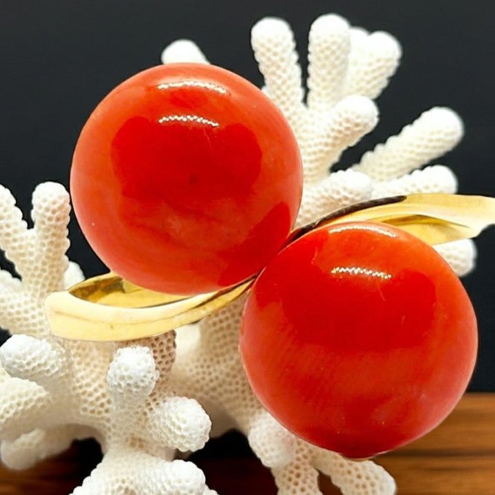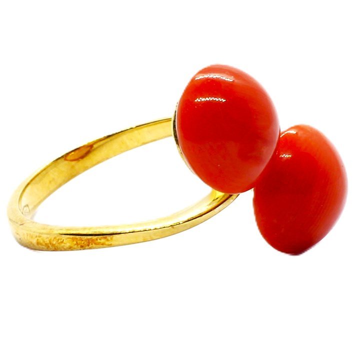 18kt yellow gold and coral by-pass ring, weight 5,60 grams.