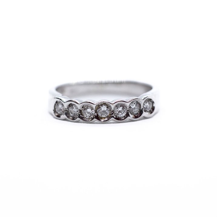 18kt white gold river ring with seven round cut briliant diamonds, 0,40 carats circa. Ring size 52/12. Weight 3,48 grams.