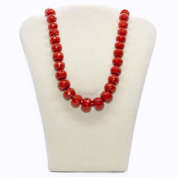 Gorgeous sardinian faceted and climbing coral necklace with 18kt yellow gold clasp. The coral, going from 6,52 mm to 12,57 mm, has been polished and inserted recentely. Weight 83,06 grams.