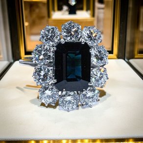 18kt white gold ring with sapphire and round brilliant cut diamonds
