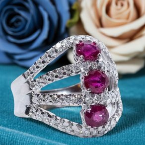 Anello in oro bianco, diamanti taglio brillante e rubini
