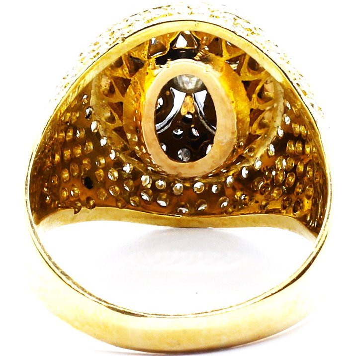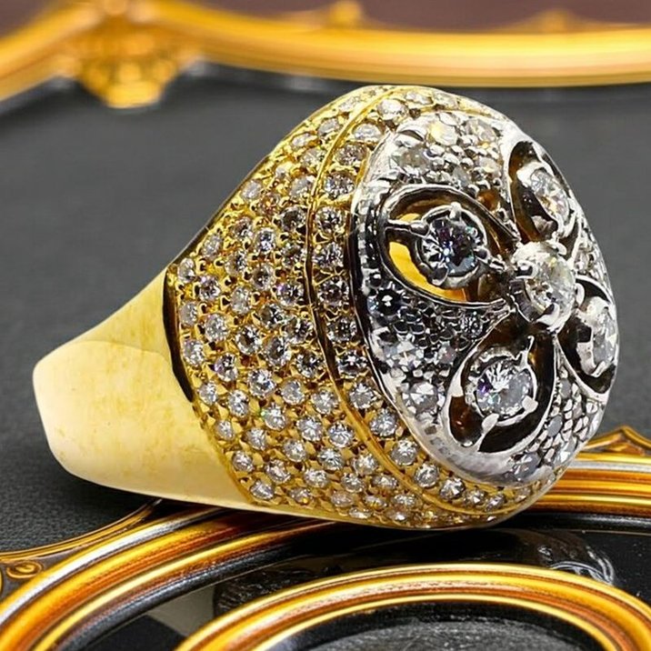 Anello a cupola anni 50 in oro giallo e bianco 18kt. Porta incastonati sul gambo e nella parte centrale diamanti di eccezionale purezza tagliati sia "single cut" che "round brilliant" ed è proprio la differenza tra i due tagli, unita alla presenza di due ori di diverso colore, a creare particolarissimi giochI di luce sul gioiello. La caratura complessiva dei diamanti (da o,10 ct a 0,01 ct) è di 2,5 carati circa ed il peso totale dell'anello è di 13,66 grammi mentre la misura al dito (sempre modificabile) è 25/65.
