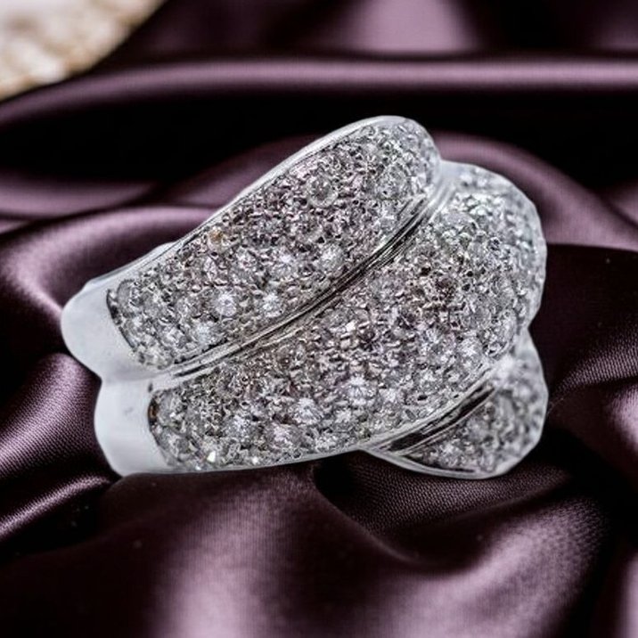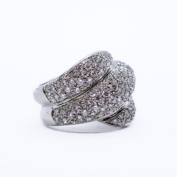 Anello a fascia intrecciata in oro bianco 18kt con pavè di diamanti taglio brillante di ottima qualità per una caratura complessiva di 2 carati circa. Misura14/54. Grammi 16,36.