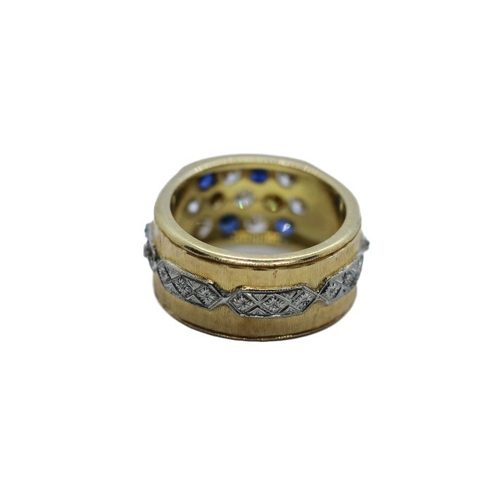Realizzato negli anni 50 da un maestro orafo che lavorava per Buccellati in oro giallo e bianco 18kt. Il gambo è lavorato in oro satinato che dona all'anello un bellissimo effetto serico e tutt' intorno ad esso è applicato un motivo in oro bianco. Nella cornice, sempre in oro bianco, sono incastonati quattro zaffiri, due citrini e sette diamanti tg. brillante da 0.10 ct cadauno di ottima qualità sia per purezza (sono pressochè puliti alla lente 10X) che per colore e accuratezza del taglio. Mis. 14/54. Pesa 9.8 grammi.