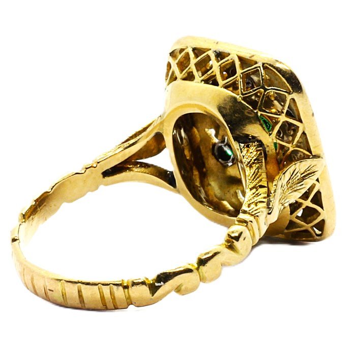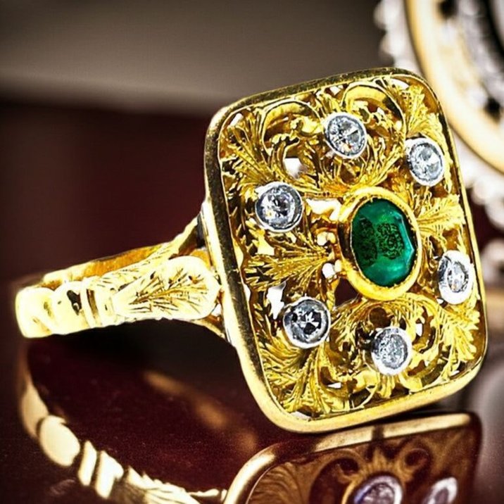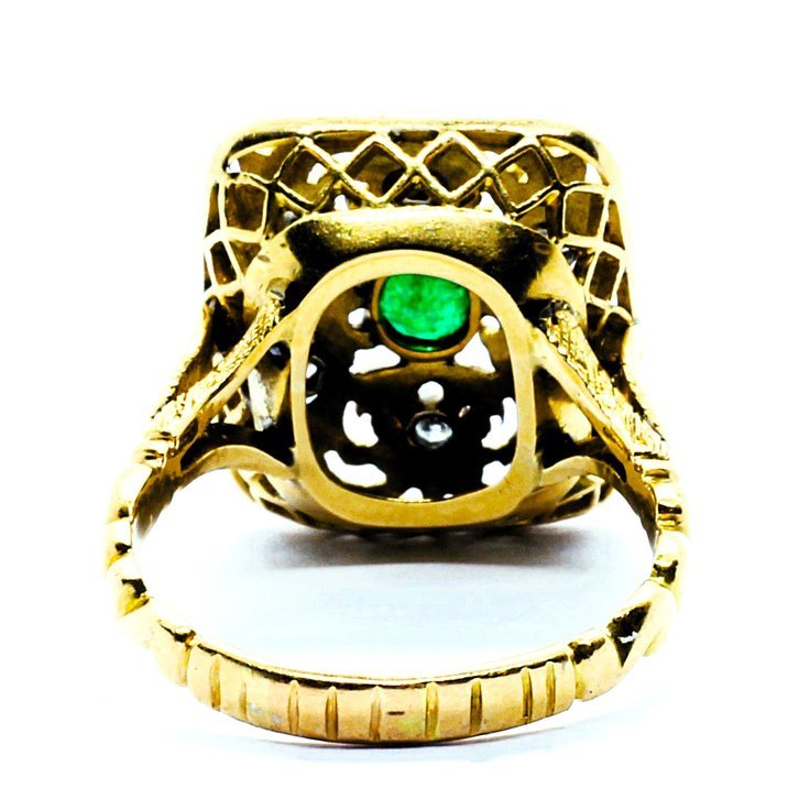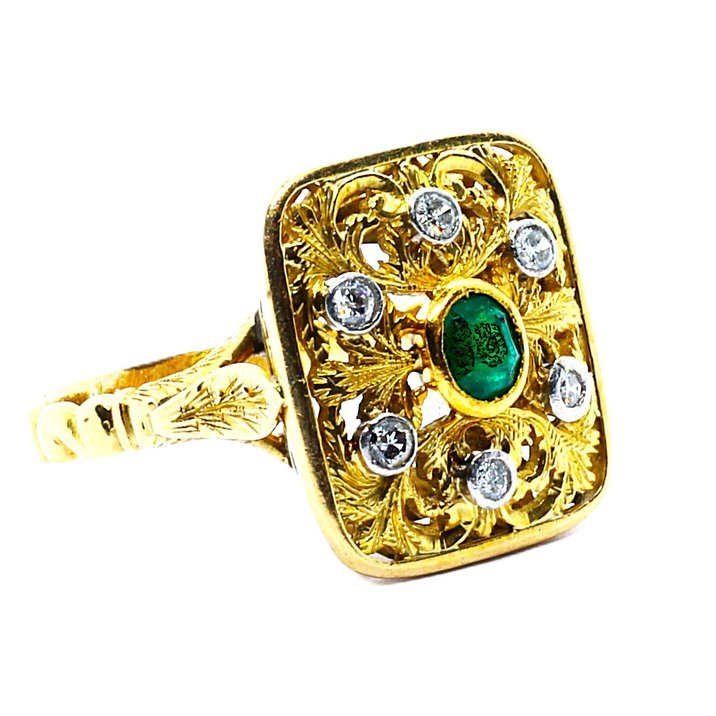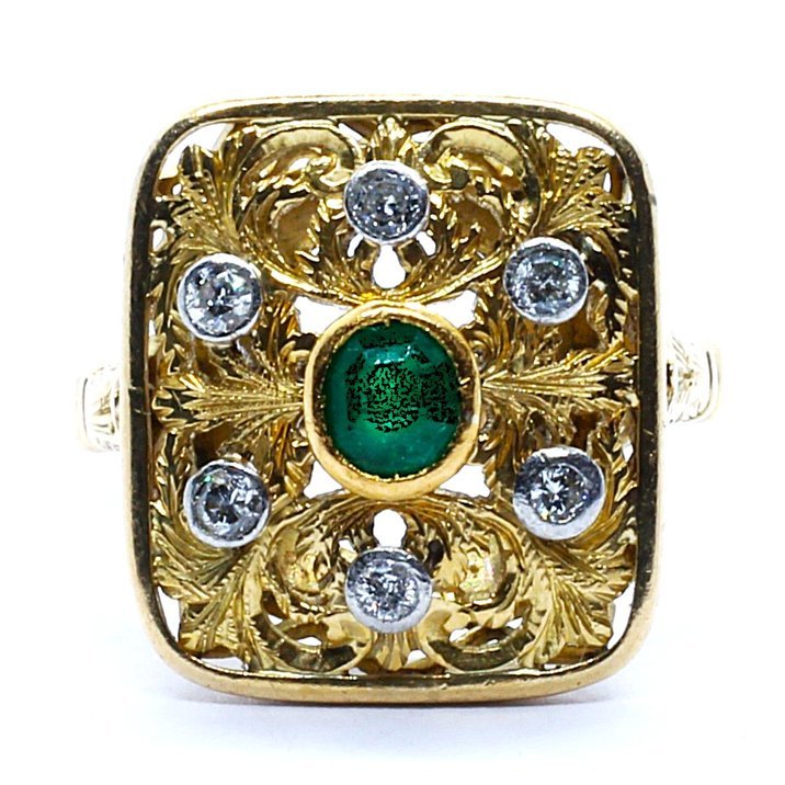 Anello anni 50 in oro giallo 18kt, diamanti taglio brillante e smeraldo come pietra di centro. Minuziosa e spettacolare lavorazione a bulino e traforo rifinita a cesello. Peso gr. 7,43