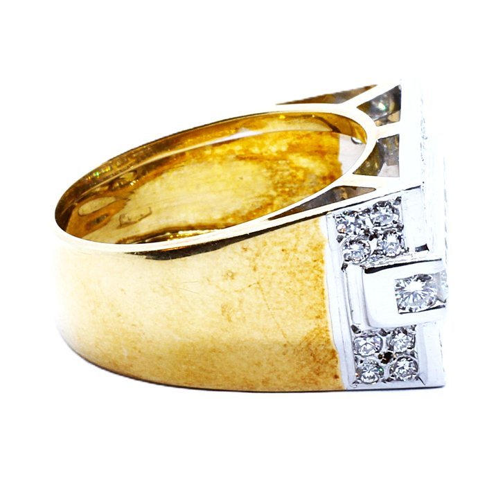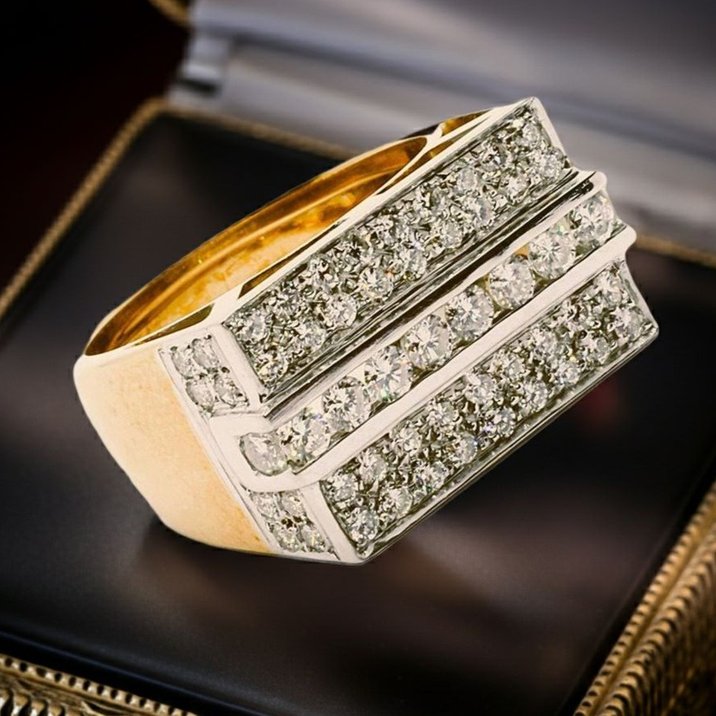 Anello in oro giallo 18kt e 62 diamanti taglio brillante di ottima qualità per una caratura complessiva di carati 1,44 ca. La misura al dito (sempre modificabile) è 18/58, il peso dell'anello è di 11,67 grammi.