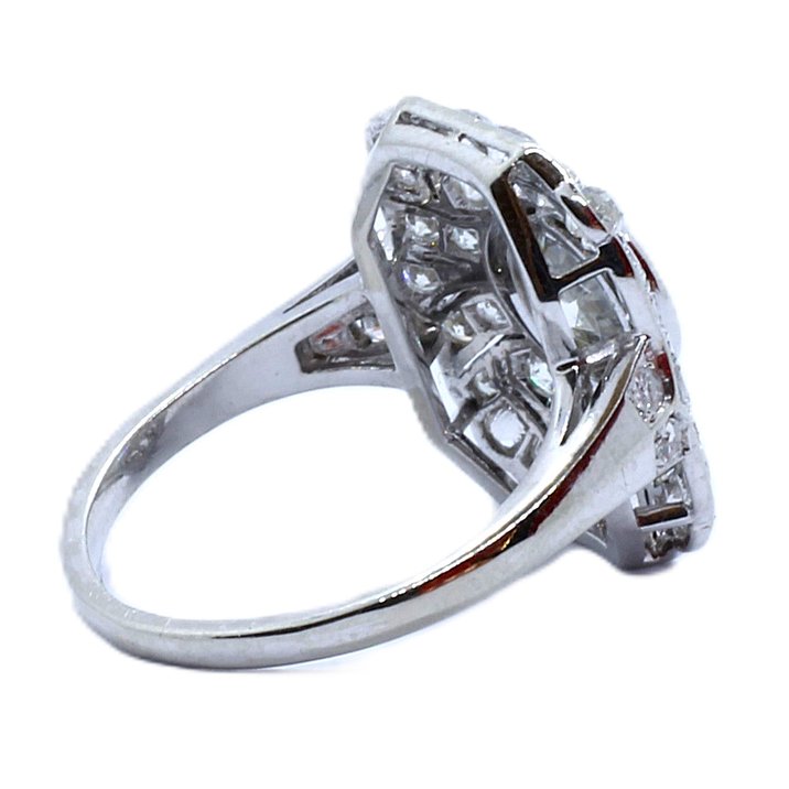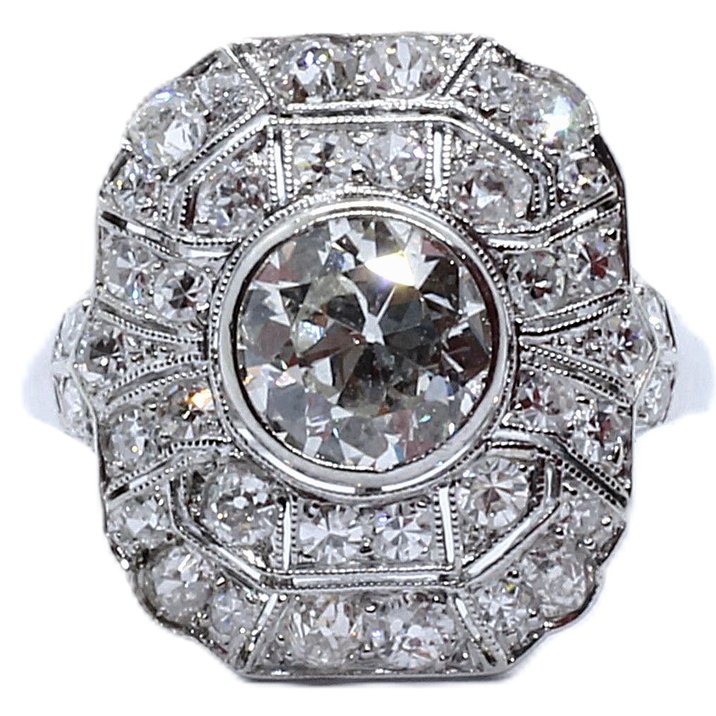 Anello in oro bianco 18kt e diamanti. La pietra di centro è un diamante taglio brillante di 1,25 ct. ca. Le pietre di contorno sono diamanti taglio "single" e "table cut" per un totale di altri 0,65 ct. ca. Peso gr. 4,22. Corredato di Certificato Gemmologico.