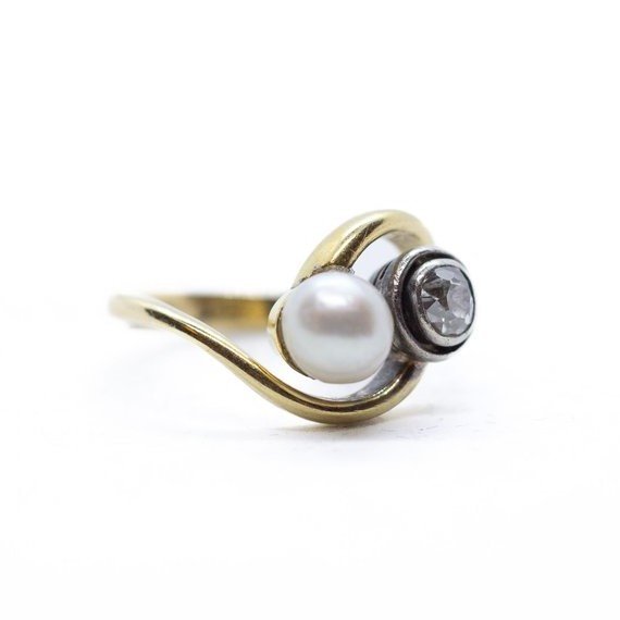Anello contrariè antico in oro 18kt e una piccola cornice in argento a contorno di un diamante da 0,40 carati circa taglio "old mine" ed una perla da 6,20mm di diametro. Misura 12/52. Peso gr. 4,38.