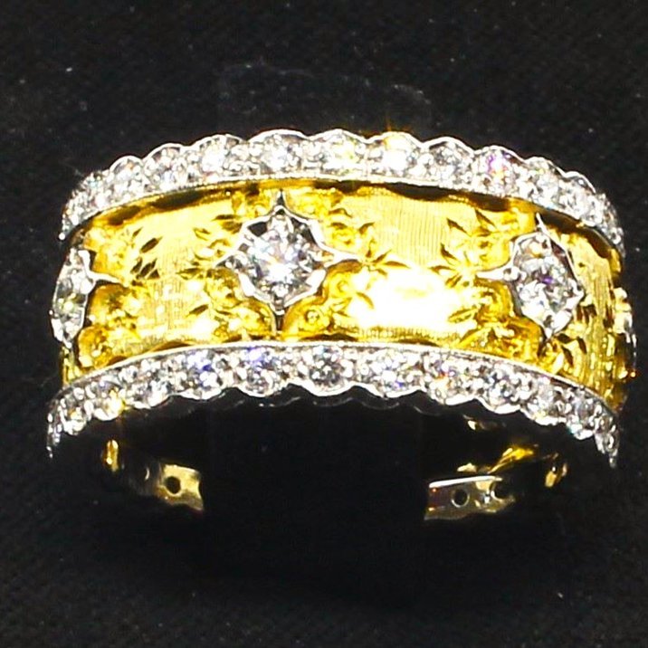 Realizzato nel classico stile Buccellati. Anello in oro giallo e bianco 18kt e diamanti taglio brillante per 1,20 ct. ca. Pesa 7,66 grammi.