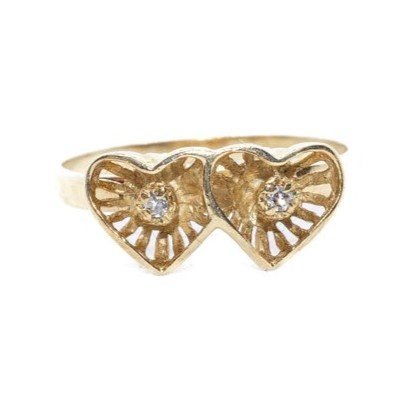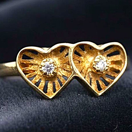 Anello in oro giallo 18kt con due cuori ravvicinati ognuno dei quali ha al suo centro un diamante "single cut". Mis. 12/52. Peso gr.1,91.