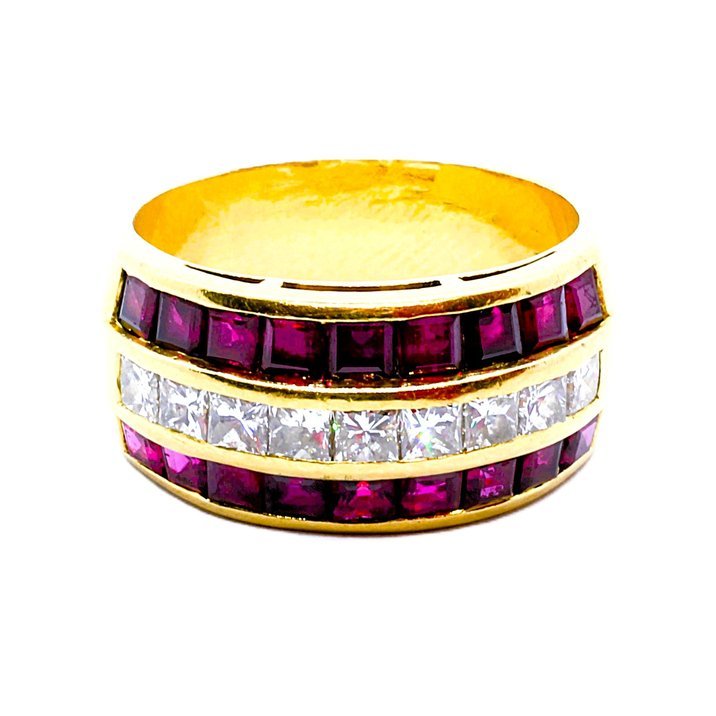Anello in oro giallo 18kt, diamanti taglio "princess" e rubini. Pesa 9,14 grammi. Gioielleria Ansuini 1860 Roma. Anni 80/90.