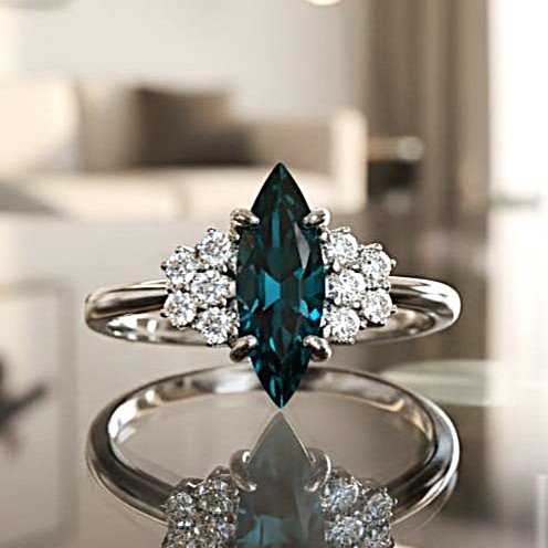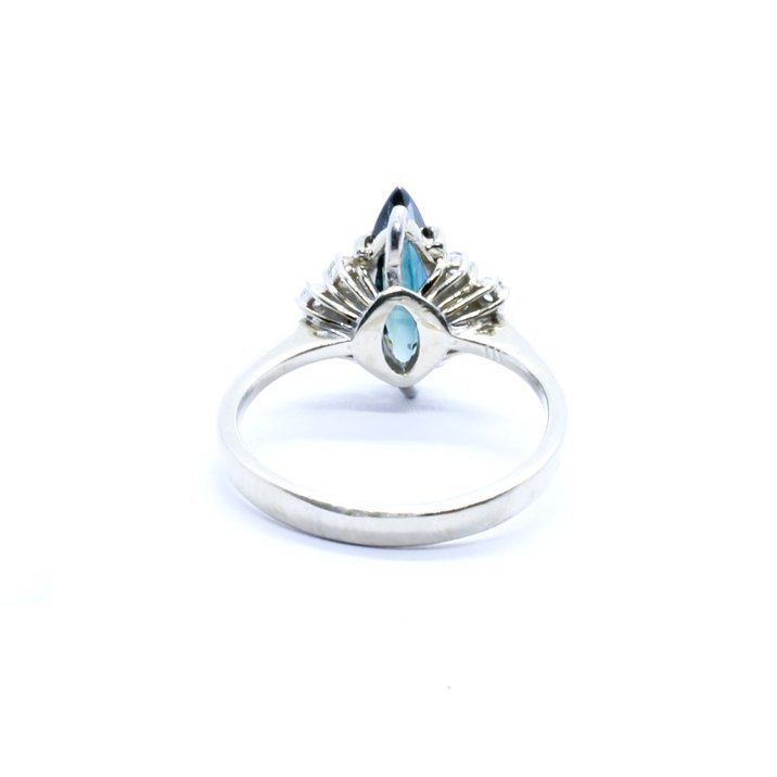Anello in oro bianco 18kt con dieci diamanti taglio "single cut" e zaffiro centrale taglio "navette". Misura (sempre modificabile) 11/51.
