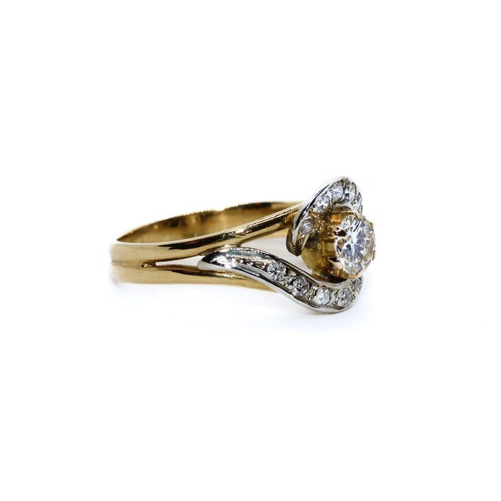 Anello "contrariè" in oro giallo 18kt " che ha come pietra centrale un diamante taglio brillante di 0,33 carati ca. più altri 12 diamanti taglio brillante rotondo e "single cut" per 0,12 ct.ca. La misura ( modificabile a richiesta) è 11/51. Pesa grammi 3,41.