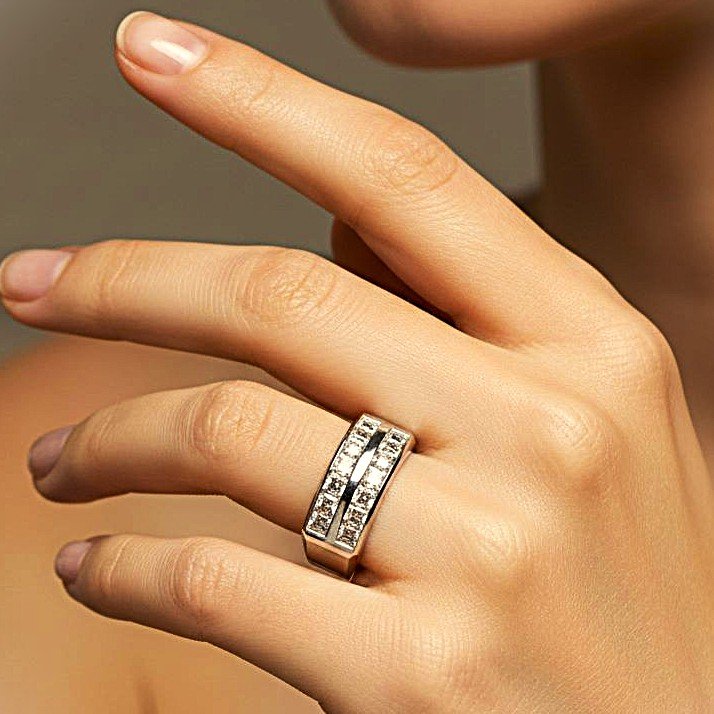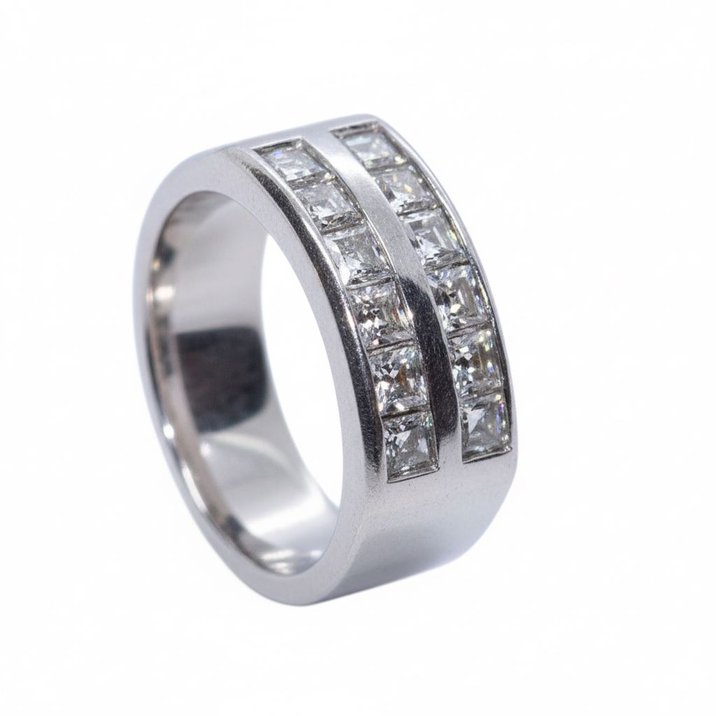Anello a fascia in oro bianco 18kt con dodici diamanti taglio "carrè" per circa 1,10 carati totali. I diamanti, come spesso avviene con questo taglio, sono pressochè privi di inclusioni. Gr. 8,07.