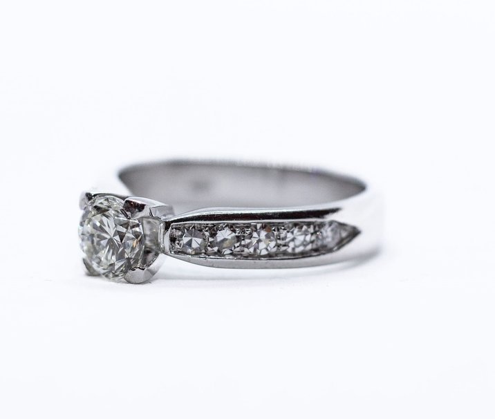 Anello in oro bianco 18kt. Centrale di 0,50 carati circa di altissima qualità per purezza, grado di colore e taglio. Fanno da contorno dieci diamanti più piccoli "single cut". La misura, sempre modificabile, è 8/48 e il peso è di grammi 3.46.