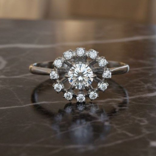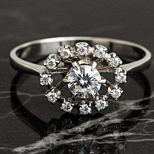 Anello in oro bianco 18kt e diamanti. Il centrale (0,23 carati) è un taglio round brilliant e dodici più piccoli di contorno sono taglio "single cut". La misura (sempre modificabile) è 16/56. Il peso gr. 2,68.