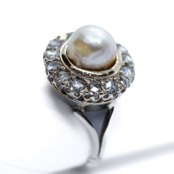 Anello in oro bianco e oro giallo 18kt, quindici diamanti taglio rosetta del peso stimato di 0,10 ct. cadauno e perla centrale di 8,30 mm. di diametro. 12/52 è la misura, modificabile a richiesta, e 6,42 grammi il peso complessivo.
