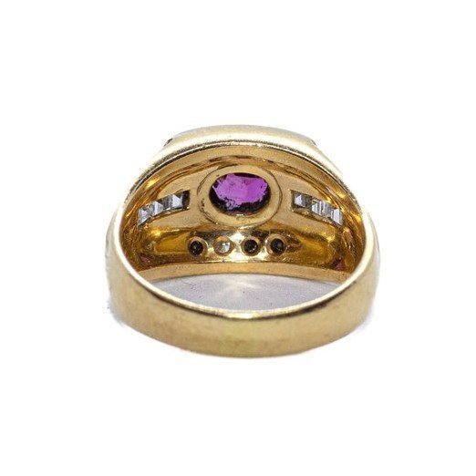 Anello in oro giallo 18kt, sei diamanti taglio smeraldo, otto taglio brillante e un rubino come pietra di centro. Pesa 9,47 grammi.
