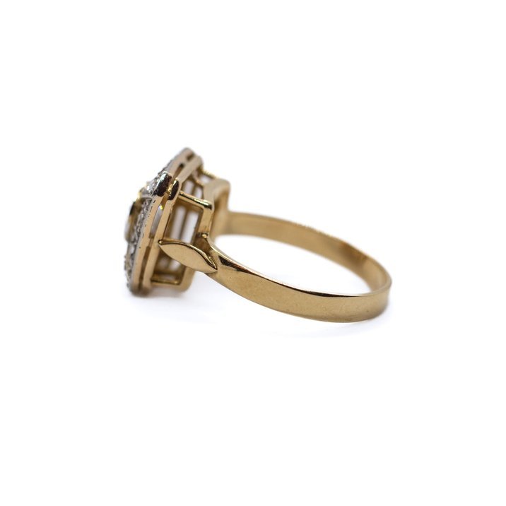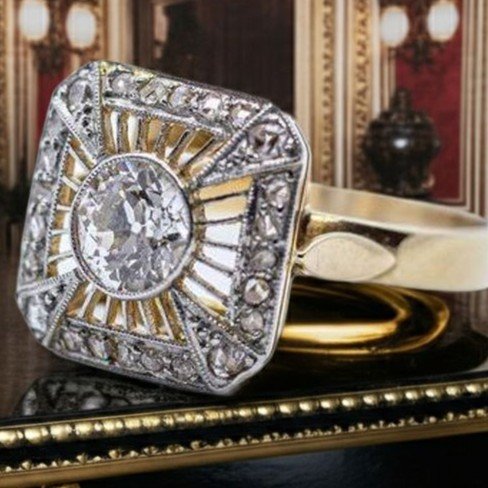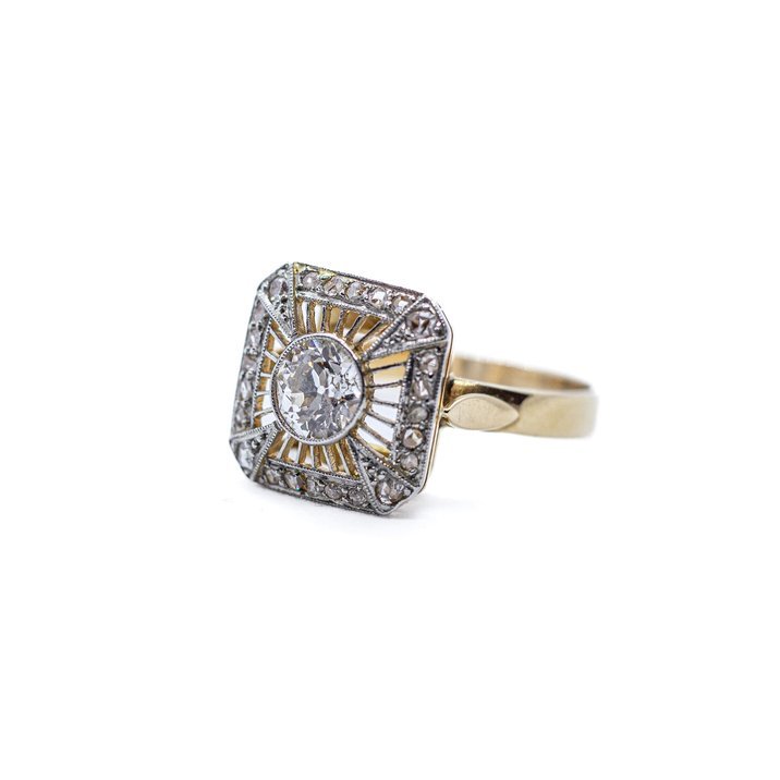Anello in oro giallo 18 Kt e diamanti. La pietra di centro, un diamante taglio "old mine" del peso di circa 0,85 ct, è incorniciato in oro bianco 18 Kt. Inoltre vi sono, come pietre di contorno incastonate sulla cornice del castone, 24 diamanti taglio rosetta per un totale di circa mezzo carato. Arte orafa italiana degli 40 del secolo scorso. E' corredato da Certificato Gemmologico attestante la qualità e le caratteristiche delle pietre.