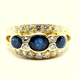 Anello "Margherita" in oro bianco e giallo 18kt, zaffiro ( 3,0 ct. ca.) e diamanti taglio marquise e round brilliant per 2,5 carati ca. Bellissima la qualità delle pietre. La misura al dito (sempre modificabile) è 14/54, il peso totale dell'anello è di grammi 5,87.