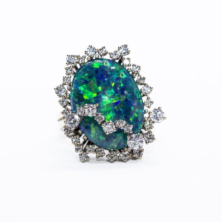 Anello in oro 18kt con opale nobile nero e diamanti tg. brillante per una caratura complessiva di 0,90 carati circa. Mis. 19/59. Peso gr. 15,13.