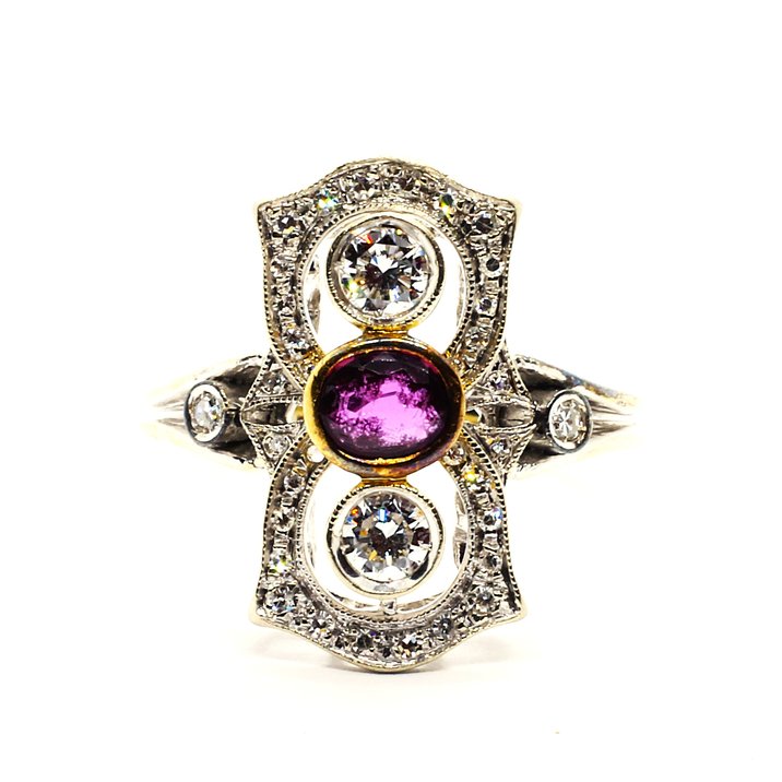 Anello in oro bianco 18kt, due diamanti taglio brillante per 0,40 carati ca. e un rubino come pietra di centro. Vi sono inoltre altri due diamanti taglio brillante e diamanti "single cut" sulla cornice della montatura. Il totale dei diamanti raggiunge 0,75 carati ca. Peso gr. 5,42.