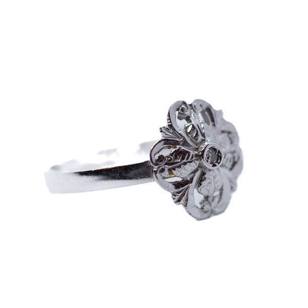 Anello in oro bianco 18kt (lavorato a bulino, cesello e traforo) e piccolo diamante taglio brillante. Misura 14/54. Peso gr. 2.22.